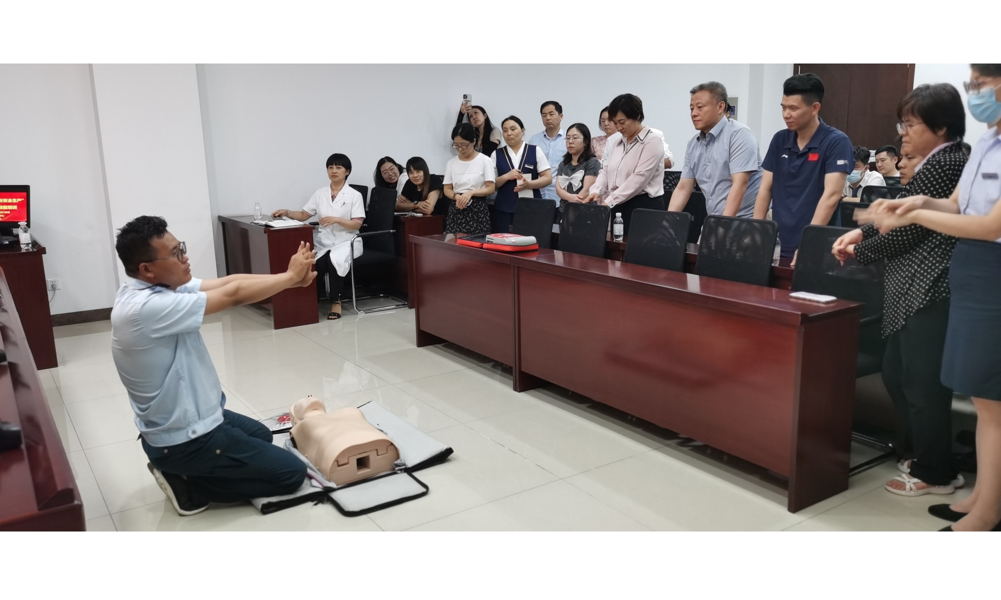 培训中,医护人员介绍了急救的重要性、基本原则及常见误区,针对常用的心肺复苏术、海姆立克急救法和自动体外除颤器使用方法等进行了详细讲解和示范。在医护人员的指导下,参训人员进行了模拟演练,力求每个动作标准规范、精准到位。
